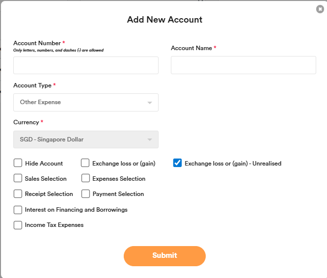 - Other Expense — For non-operating expenses (e.g., interest on borrowings, income tax, exchange gains/losses). Selectable in manual journals.